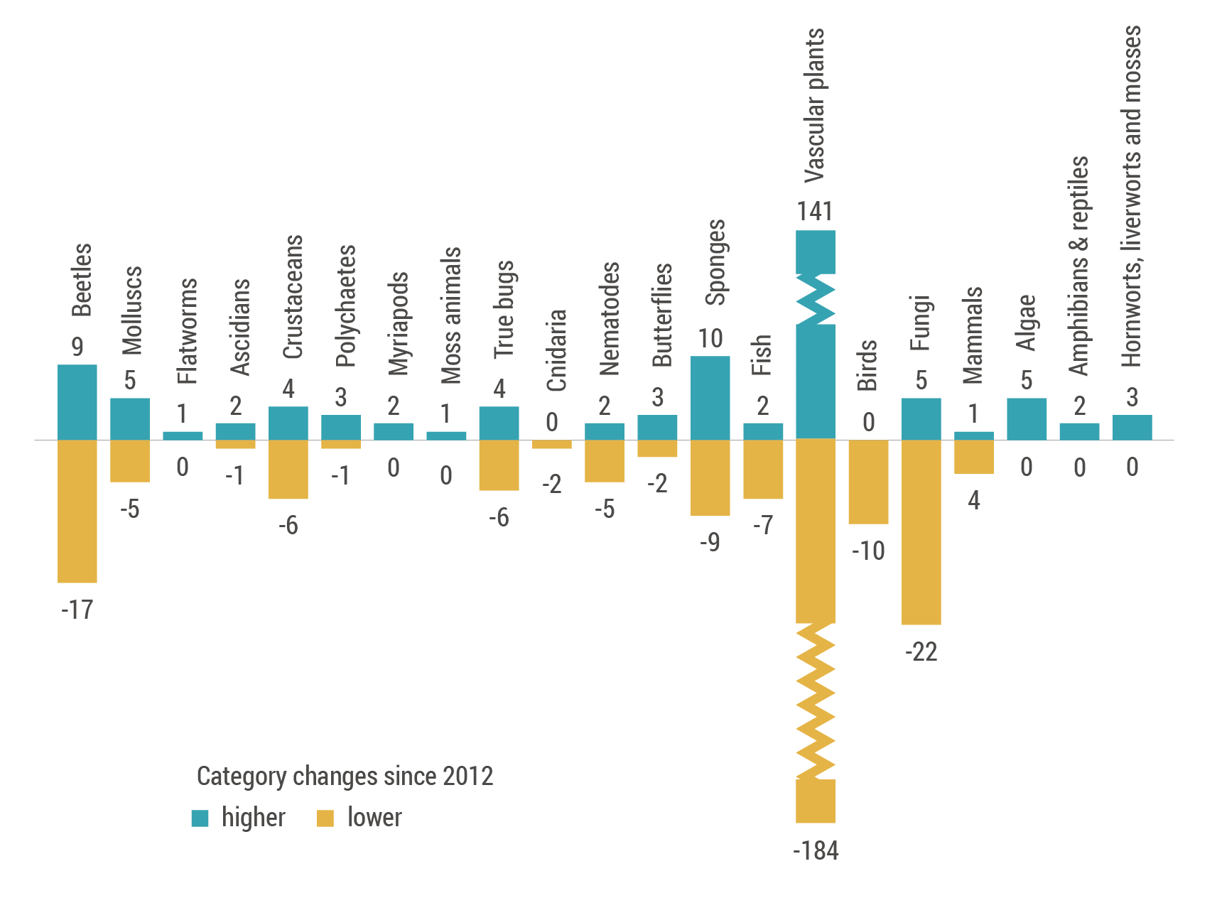 The number of species, divided into different species groups, which have gone up or down in a risk category. The result is based on the 1081 species which were evaluated in both 2012 and 2018.