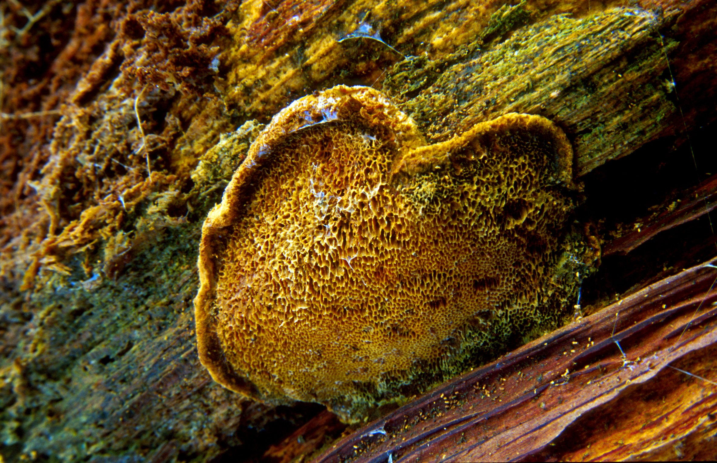 Dette eldre eksemplaret av safrankjuke Aurantiporus croceus er funnet ved Høydalsfjellet i Drangedal i 2003.