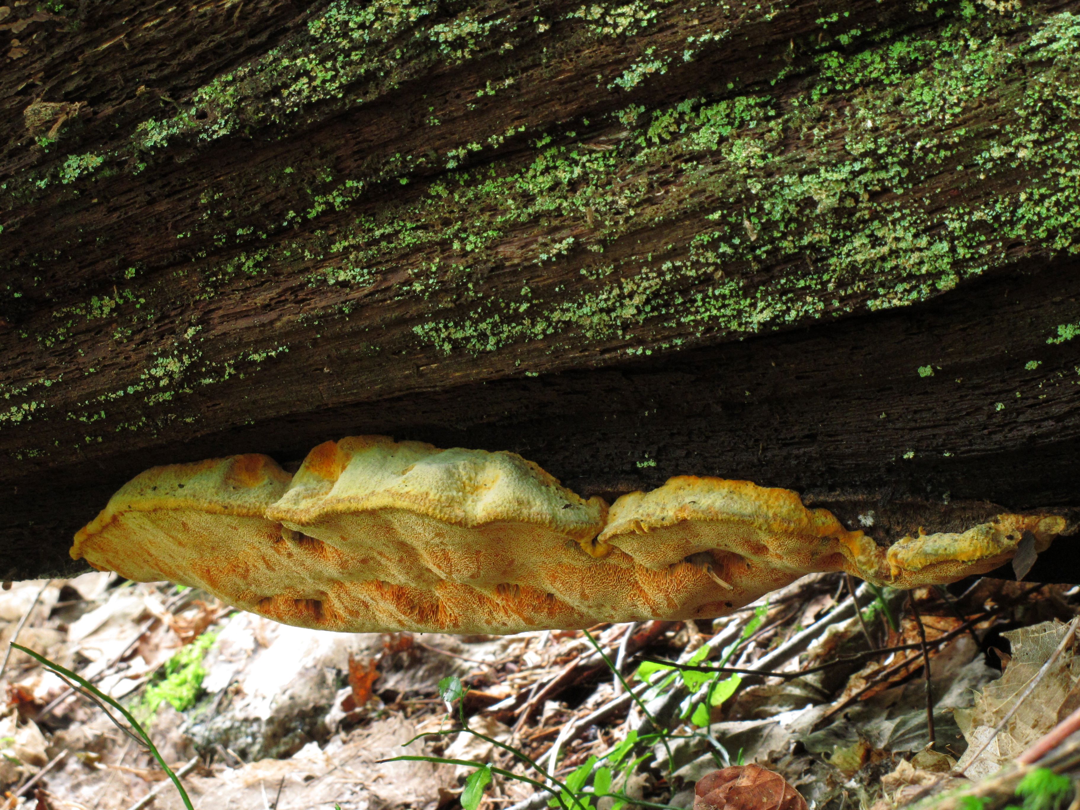 Safrankjuke Aurantiporus croceus har store fruktlegemer med livlige gule til oransje farger. Her er den funnet vest for Siljufjellet i Drangedal.