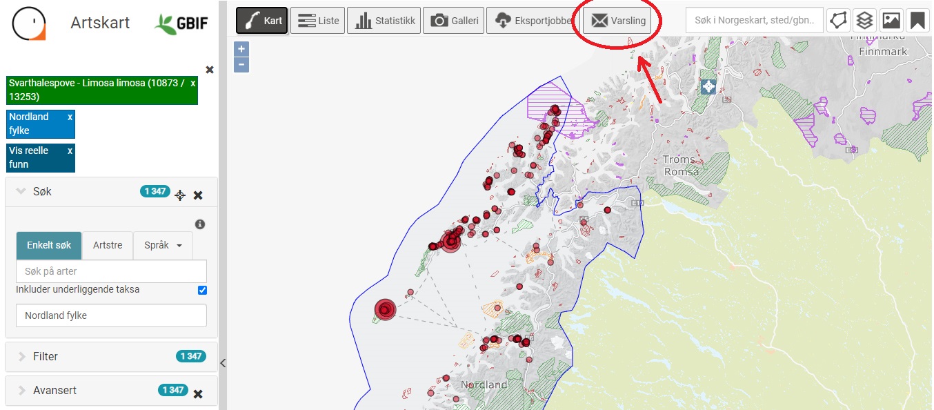 Det er mest berre fantasien som set grenser for kva du kan bruke Artsdatabankens varslingsteneste til. Om du er hobbyornitologen med interesse for svartehalespove i Nordland – opprett et varsel. Det same om du er botanikar frå Sunndalsøra som ønskjer å følgje med på nye funn av trua planter på Nordmøre, eller jegeren som ønskjer å følgje med på nye funn av villsvin i gamle Østfold fylke.