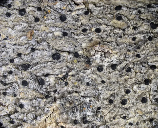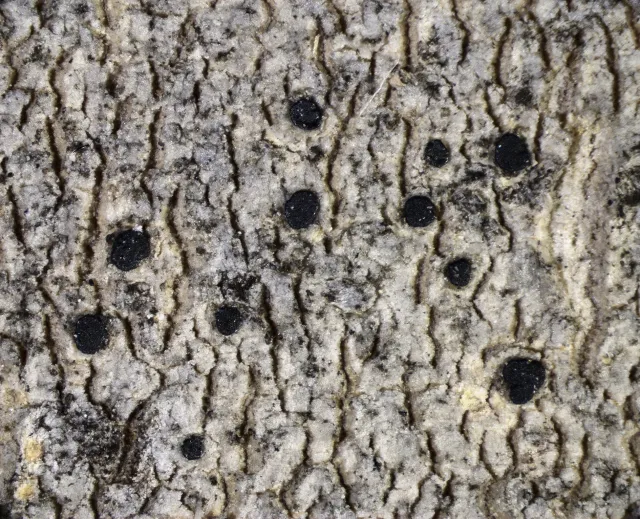 Ospeflekklav Arthonia patellulata samlet på osp i Evje og Hornnes (O-L-221323).