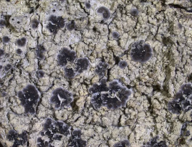 Fruktlegemene er flekkforma, uregelmessig avrunda, som regel tydelig avlange med fliker og ofte svakt nedsunket i midten. De er som regel dekket av et tynt, hvitt belegg (pruina), er svakt opphøyet og godt festet til talluset. Et svært karakteristisk trekk er et tynt spindelvevsaktig sjikt av sopphyfer langs kanten som forbinder fruktlegemet med det tilstøtende talluset. Disse hyfene kan mangle hos noen eksemplarer. Fruktlegemene er ca 0,3–1,5(–2,0) mm breie og ca 70–100 µm høye.