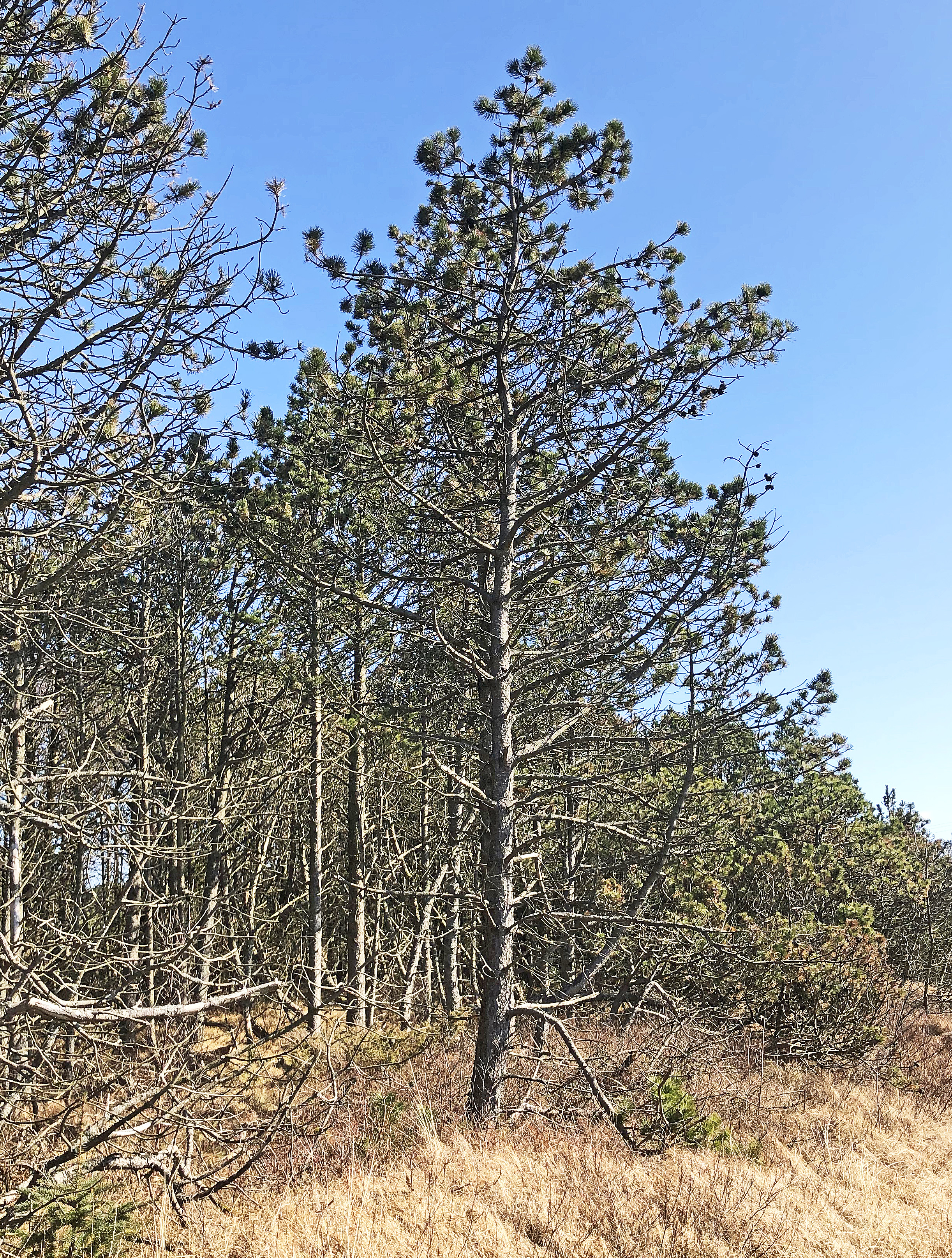 Alpebergfuru veks om lag alltid som eit opprett, oftast einstamma tre, her på Lista.