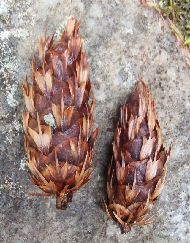 Konglene hos kystdouglasgran har rette, tiltrykte dekkskjel.