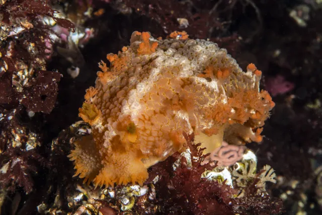 Tritonia hombergii i sitt typiske habitat, blant dødmannshånd.