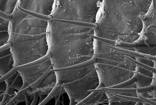 Chaetozone pseudosetosa. Scanning electron microphotography of the spines encircling the posterior segments.
