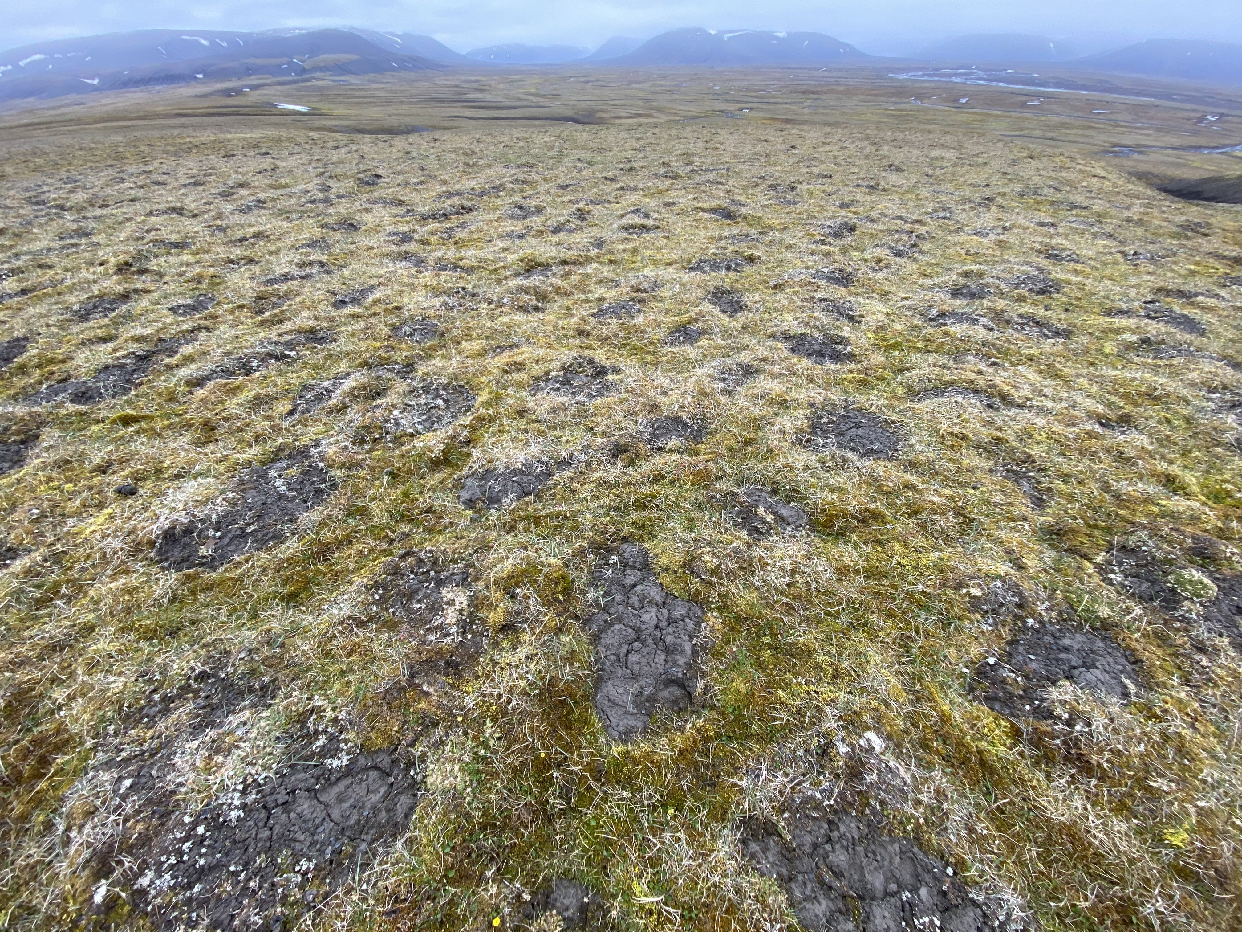 Oppfrysningsmark med polygondannelser i mosemark på Edgeøya.