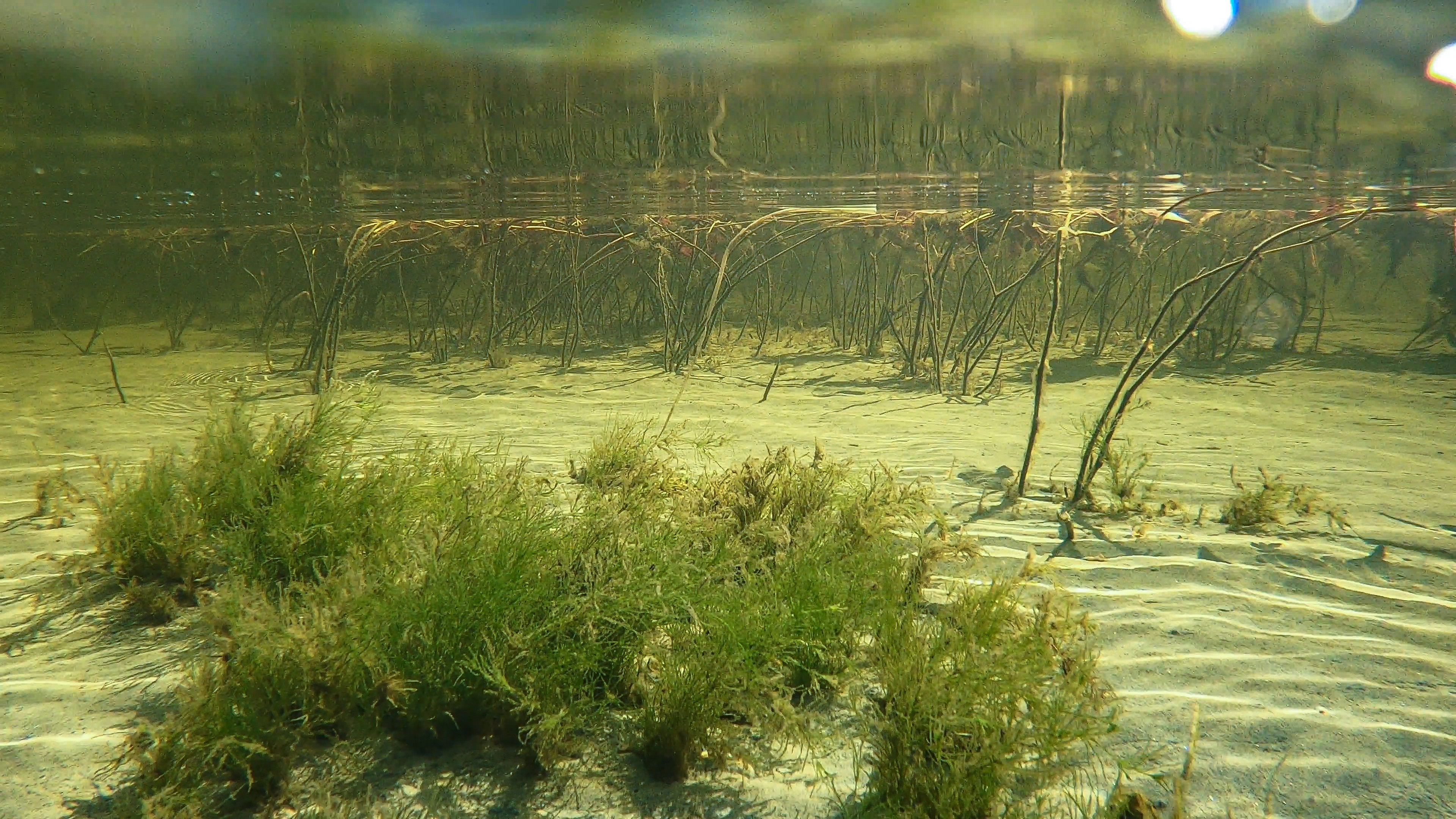 Moderat kalkrikt (5,3 mg Ca/l) plantebelte sand (D50 = 0,5 mm) i Tyrifjorden i Modum kommune. Flytebladsplanten vassslirekne Persicaria amphibia i bakgrunnen og kransalgen mattglattkrans Nitella opaca i forgrunnen.