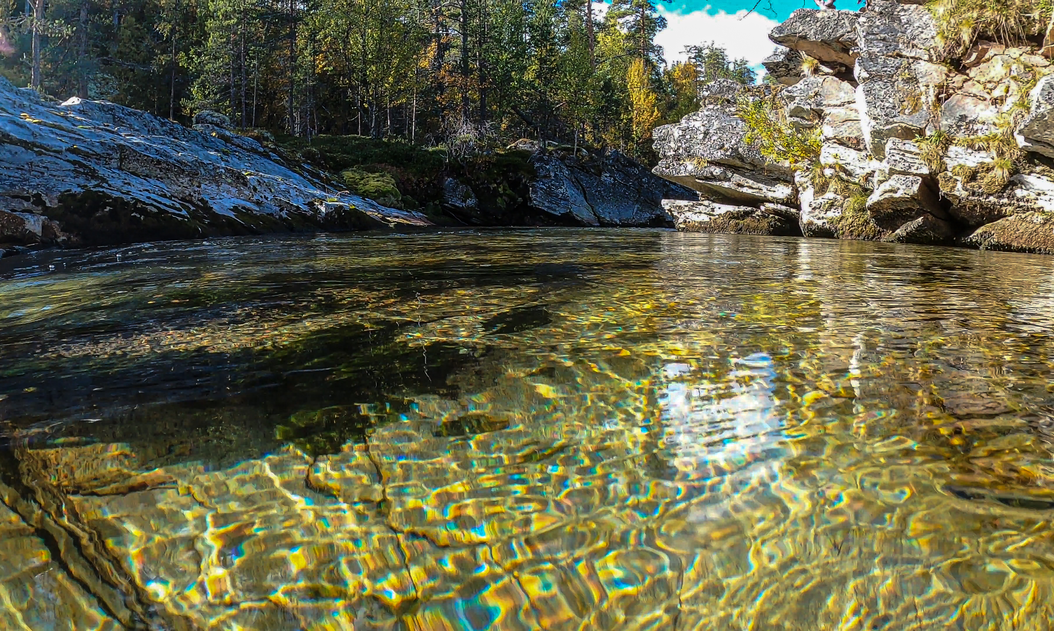 Noe kalkfattig (0,9 mg Ca/l) fastbunn (på fast fjell) i klar og roligflytende elv i Atna i Folldal kommune