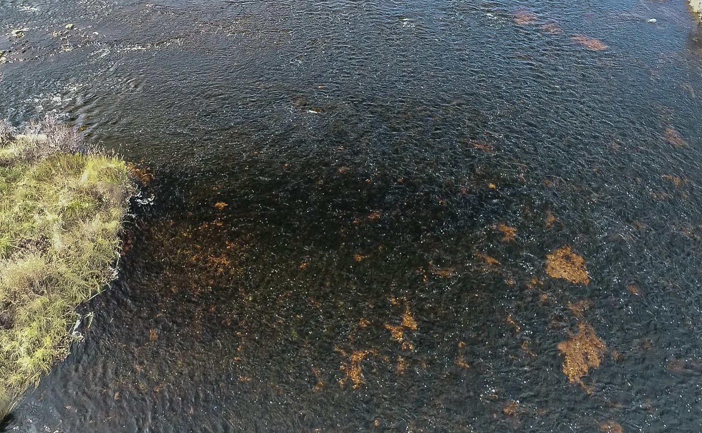 Kalkfattig (0,6 mg Ca/l) steinbunn (D50 = 150 mm) i humøs (35 mg Pt/l) elv i Mistra i Rendalen kommune. Elvebunnen har mye elvemose på steinene.