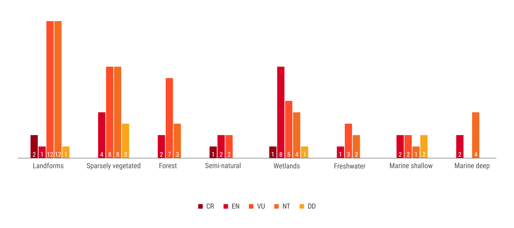 Number of ecosystem types in the Red List categories Critically Endangered CR, Endangered EN, Vulnerable VU, Near Threatened and Data Deficient DD for landforms, sparsely vegetated habitats, forest, semi-natural habitats, wetlands, freshwater, marine shallow waters and marine deep sea.