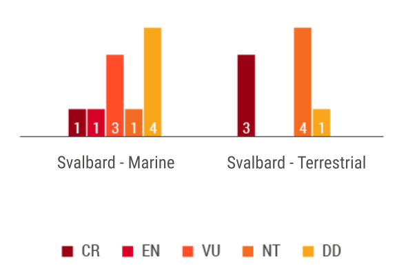 On Svalbard, 47 ecosystem types have been assessed. Of these, 17 ecosystem types (36 %) are on the Red List, and 30 ecosystem types (64 %) are assessed as Least Concern. Nine ecosystem types are assessed as threatened, comprising 16 % of the assessed ecosystem types on Svalbard.