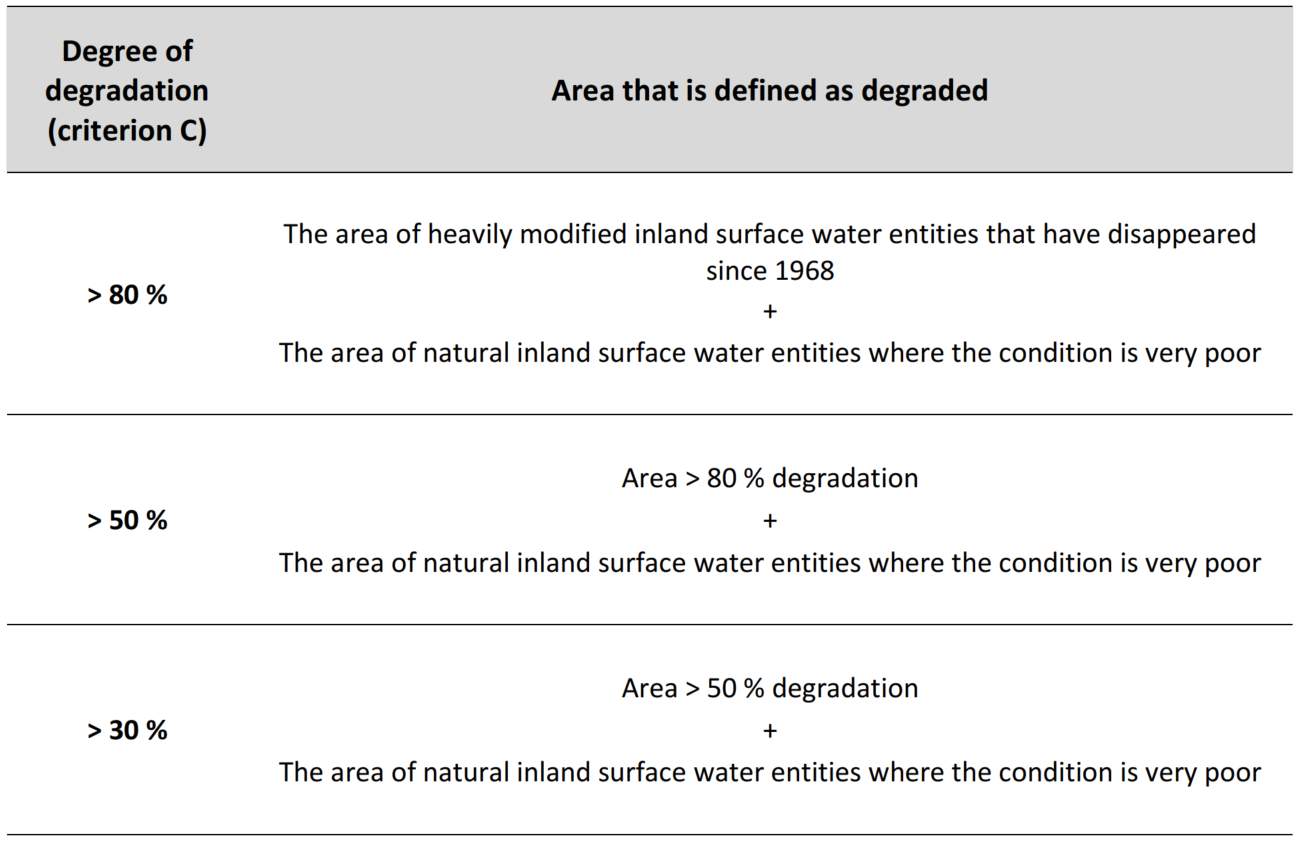With assessment on the basis of criterion C1, the proportion of the area of the ecosystem type that is degraded is evaluated. Different degrees of degradation are estimated based on data collected for the purpose of undertaking ecological condition assessments in accordance with the Water Management Regulations. See the table below:
