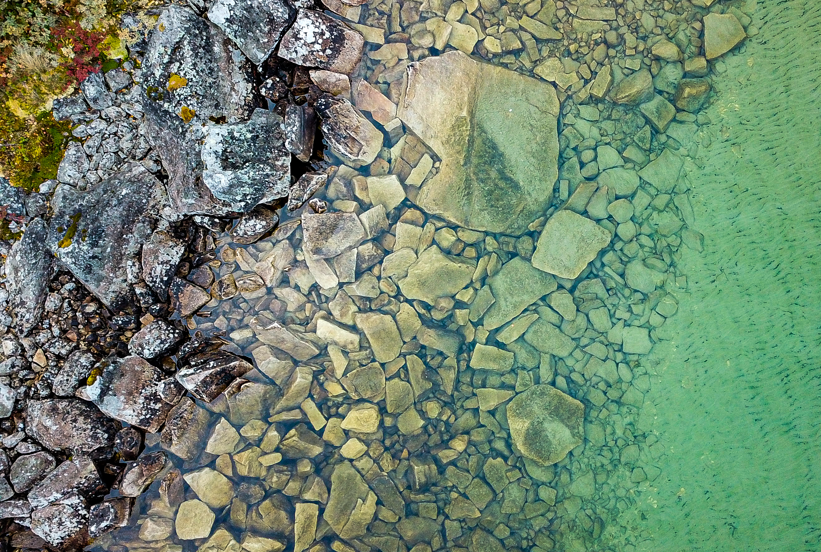 Samme lokalitet som over sett fra land. L1-5 Noe kalkfattig (1,2 mg Ca/l) og eksponert fast strandkant bestående av store blokker med diameter mellom 0,5 og 4,0 m. Fra Femunden i Engerdal kommune.