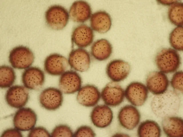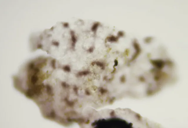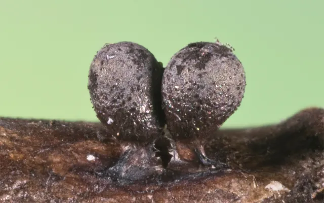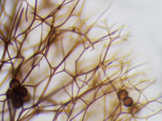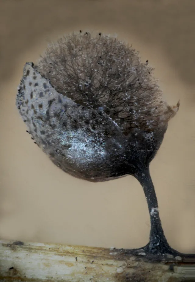 Sporokarp der peridiet har spukket opp og kapillitium vises på høyre halvdel. De fleste sporene er sluppet, men noen få sitter igjen i kapillitiumet.