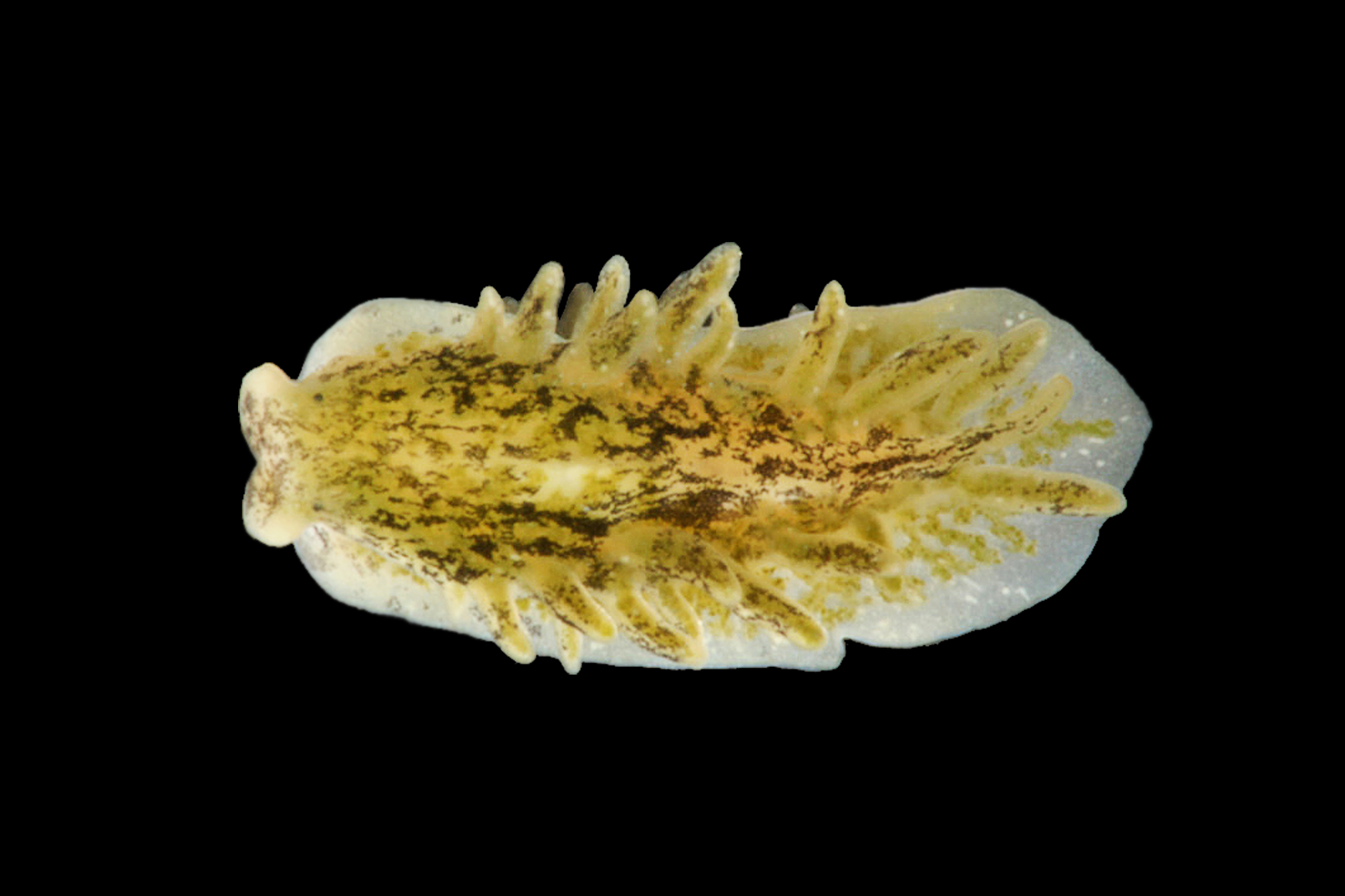 Kroppsfargen er gjennomsiktig gulbrun. Ytre pigmentering består av brune, grønne og hvite flekker som dekker hele ryggsiden og cerata. Tarmkanalene i cerata har en gulgrønn farge.