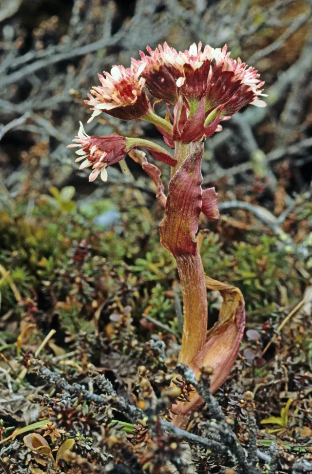 Den heimlege fjellpestrota har, til skilnad frå dei andre artane i slekta, nokså få korger i ein halvskjerm.