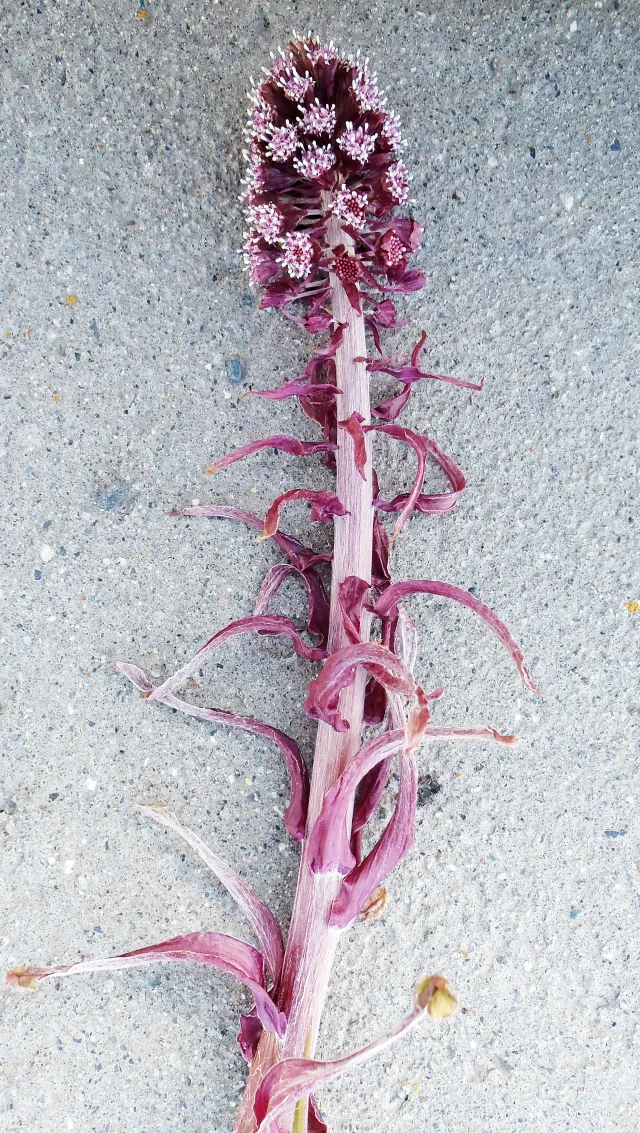 Vårstengelen hos lækjepestrot er raudfiolett med mørkt fiolette skjelblad.