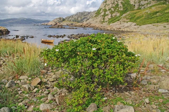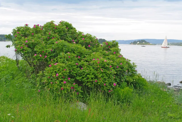 Rukkerose er mest vanleg på havstrender eller langsmed større innsjøar. Her frå Asker i Akershus.
