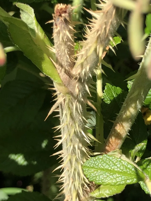 Rukkerose har filthåra unge skott, og grunnen av dei største tornane er filthåra.