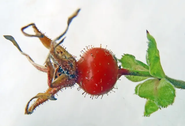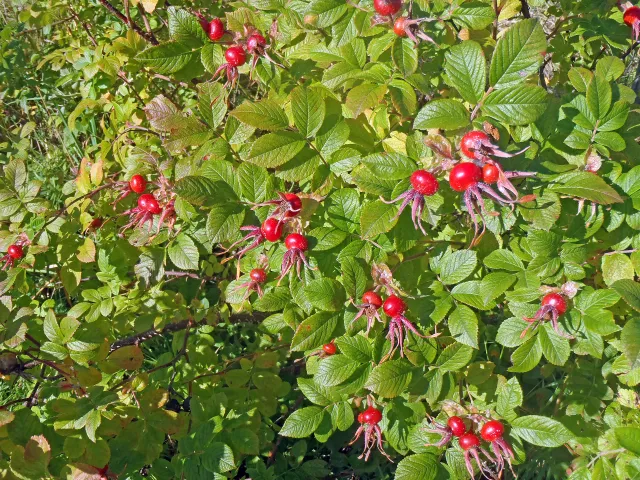 Nypene hos rukkerose er breiare enn lange og ser noko flatklemde ut.