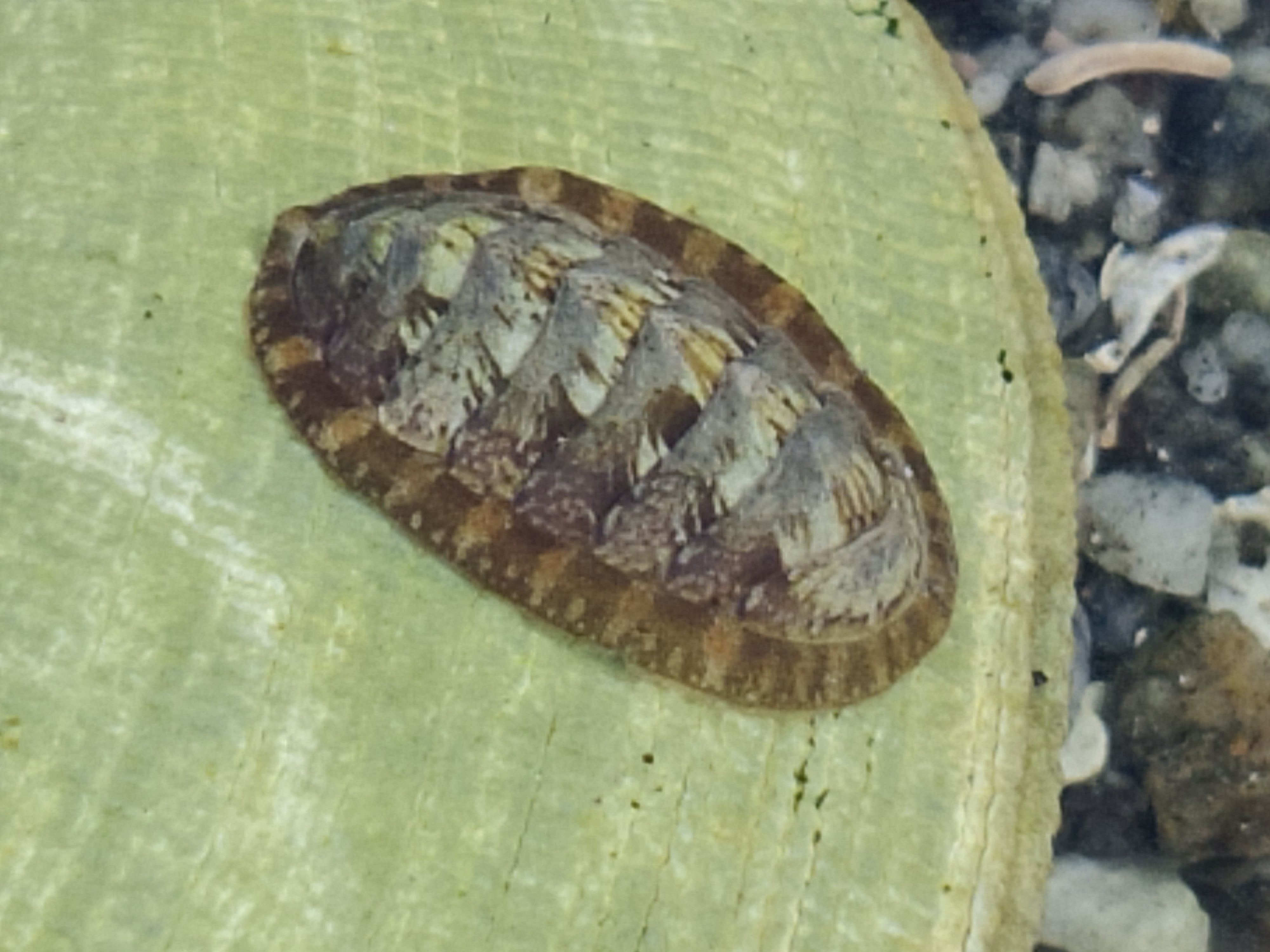 Innsamling av leddsnegler i felt. Her sitter Lepidochitona cinerea på et tomt skjell.