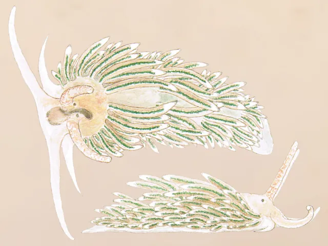 Henning Lemches akvarell av Facelina dubia fanger godt den grønne fargen, og de glatte rinoforene.