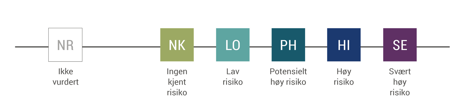 Når fremmede arter vurderes blir de plassert i en av følgende kategorier: NK ingen kjent risiko, LO lav risiko, PH potensielt høy risiko, HI høy risiko eller SE svært høy risiko. Arter som faller utenfor definisjoner og avgrensninger blir ikke vurdert, og havner i kategorien NR ikke risikovurdert.
