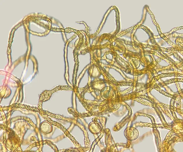 Arten danner små, spredte, kuleformede sporokarper uten, eller med korte skaft. Peridiet er rødbrunt eller mørkt brunt og inneholder granulært materiale og er derfor ugjennomskinnelig. Kapillitiet er forgrenet med uregelmessig spiralornamentering med spredte, korte pigger. Sporene måler 10–13 µm og er fint og tett pigget. Varieteten pardina har et peridium som er brunflekket på gul bakgrunn.