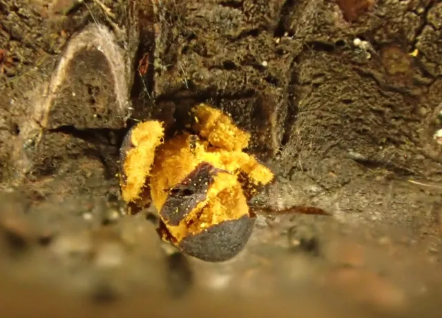 Arten danner noe avflatede, puteformede sporokarper eller litt avlange eller nyreformede plasmodiokarper. Arten har et oftest svart, sjeldnere mørkt rødbrunt til svartbrunt, matt og ugjennomskinnelig peridium som sprekker opp uregelmessig. Kapillitietrådene består av ugrenede, ganske brede (6–8 µm) elaterer med 4–5 spirallister og kort spiss. Spirallistene kan være glatte, vortet, ha små pigger eller lange pigger. De svovelgule sporene er tett besatt med små vorter og måler (14–)15–19(–21) µm.