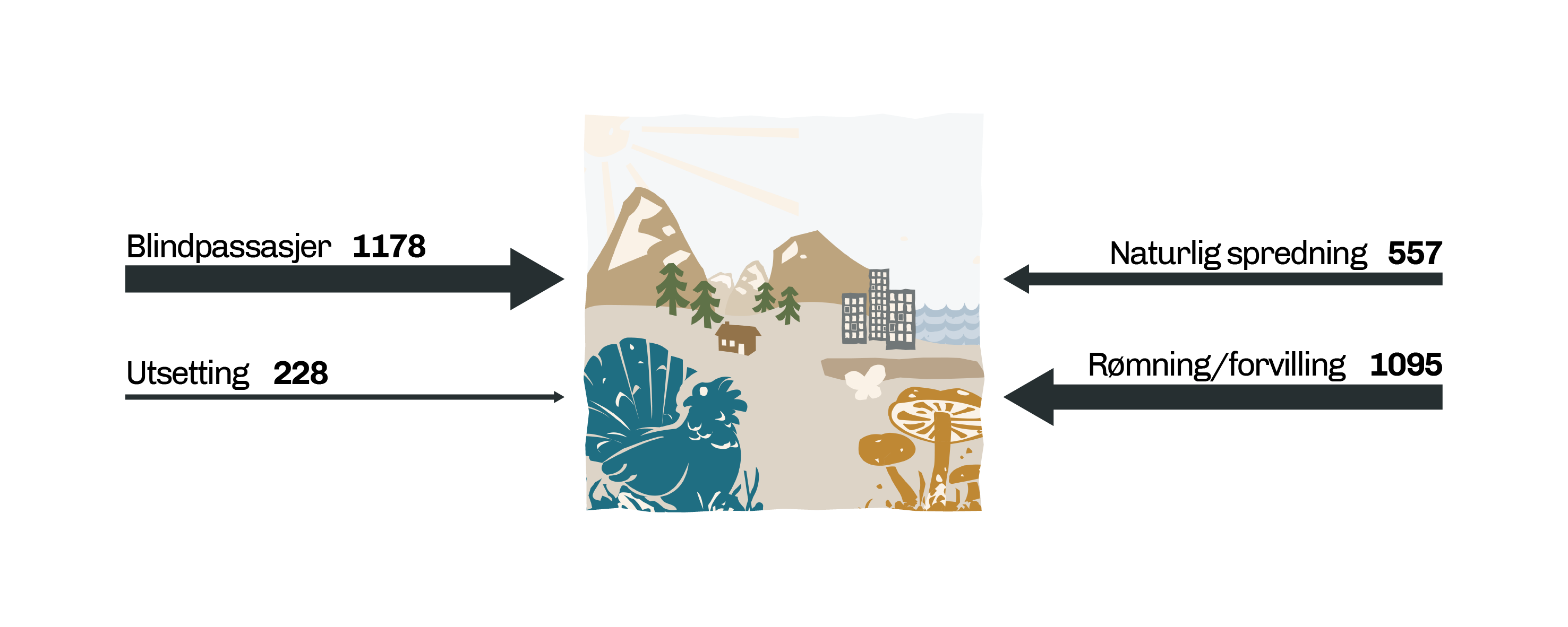 • Utsetting: Arten er med hensikt sett ut i naturen av menneske med eit føremål.