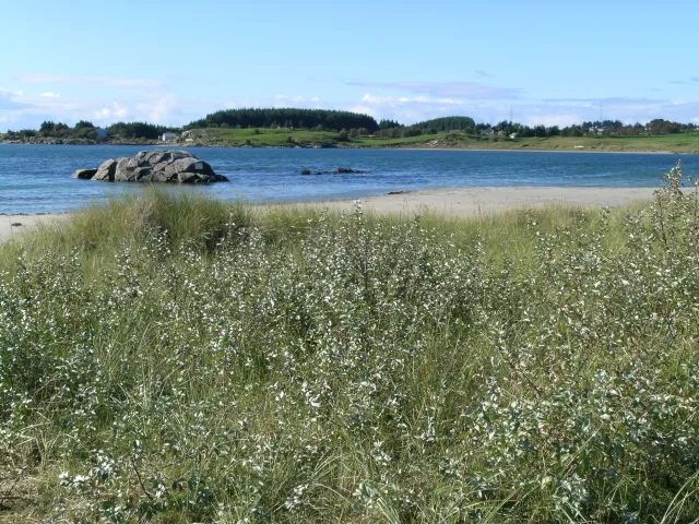 Sølvbusk-bestand i sanddyne der den er plantet for å hindre sandflukt. Fra Lista i Farsund (Vest-Agder).