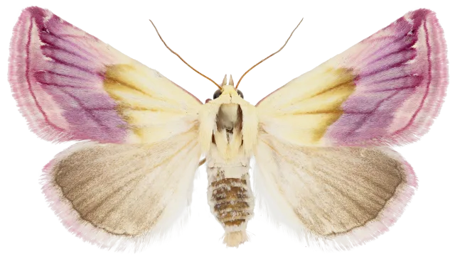 Purpurdvergfly er et lite, bredvinget praktfly. Framvingene er gule ved basis og lyst rosa med dypere rosa tegninger i ytre del.