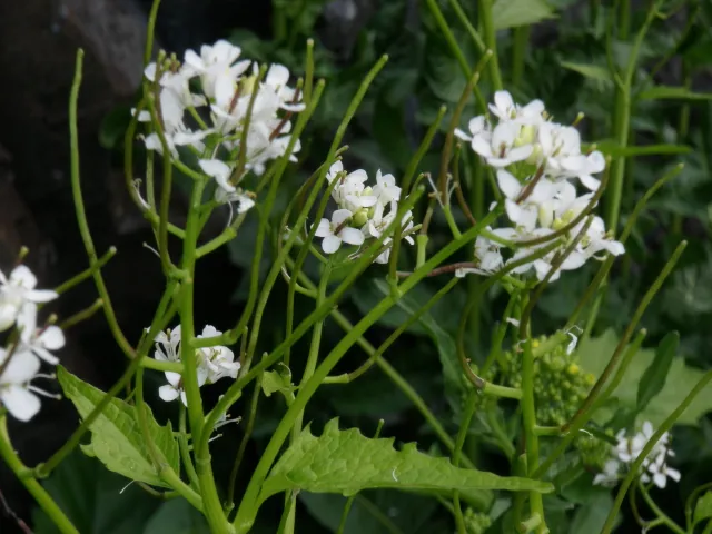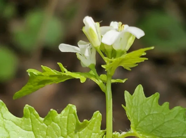 Stengelblada har kortare skaft, men er elles like grunnblada. Kvite blomar i klase.