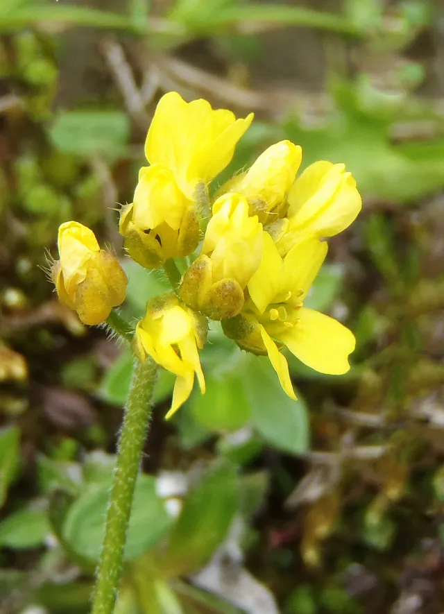 Gullrublom har djupt gule kronblad i ein klase. Blomen er halvopen, og kronblada er smale og overlappar ikkje kvarandre.