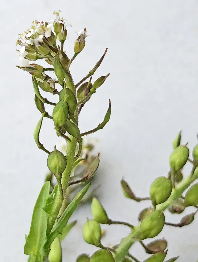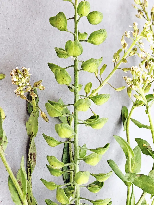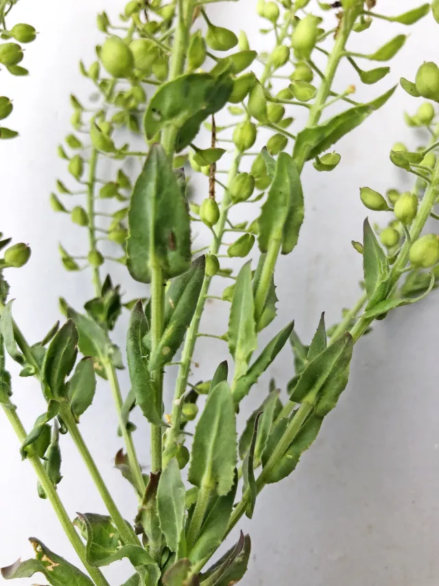 Markkarse er eitt- til toårig; sjå på den spinkle rota! Ovanfor midten har stengelen ofte mange, stivt opprette og jamhøge greiner ("kandelaberform").