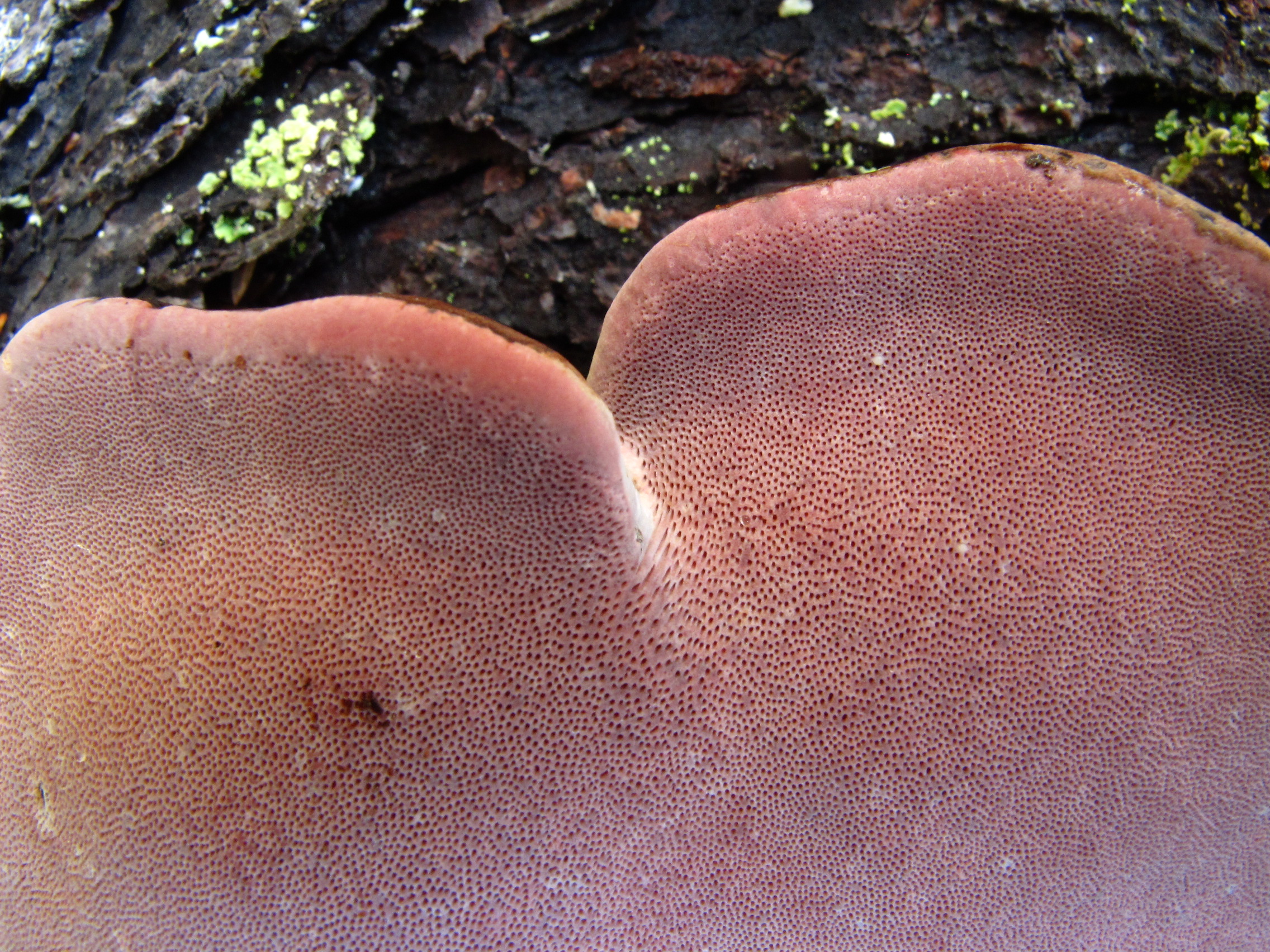 Rosenkjuke Fomitopsis rosea kjennes igjen på det rosafargete porelaget.