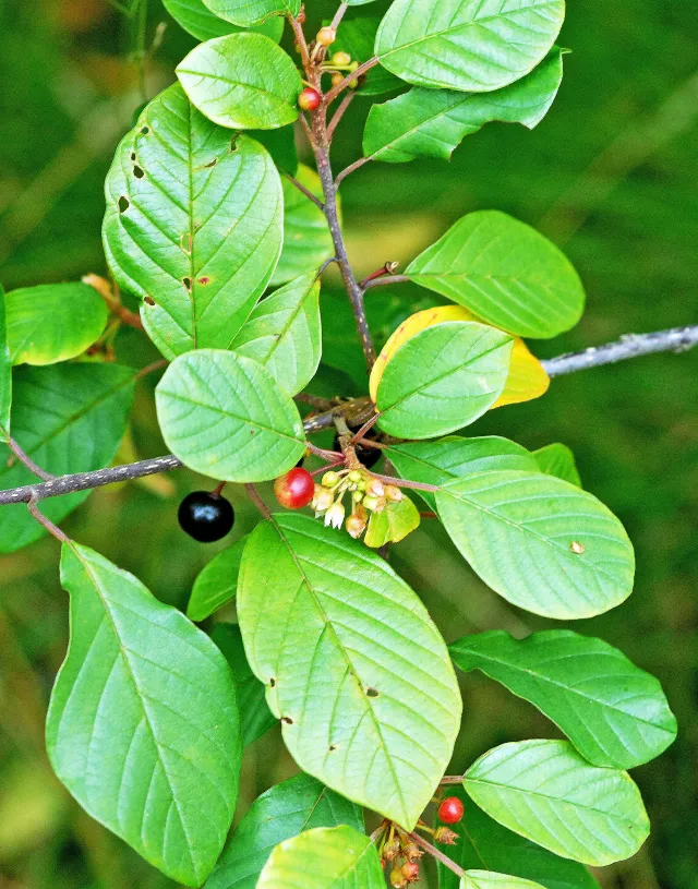 På trollhegg kan en ofte se blomst, umoden (rød) og moden (svart og blank) frukt samtidig. Fra Farsund (Vest-Agder).