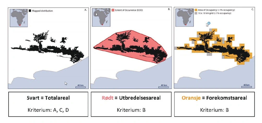 Naturtypens utbredelsesareal (B1) og/eller antall 10 km × 10 km ruter (B2) hvor typen finnes i dag. I tillegg må minst ett av tre underkriterier være oppfylt.