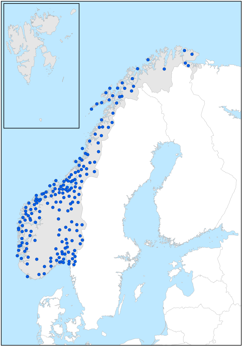 Prikkene markerer registrerte funn av arten/artsgruppen.