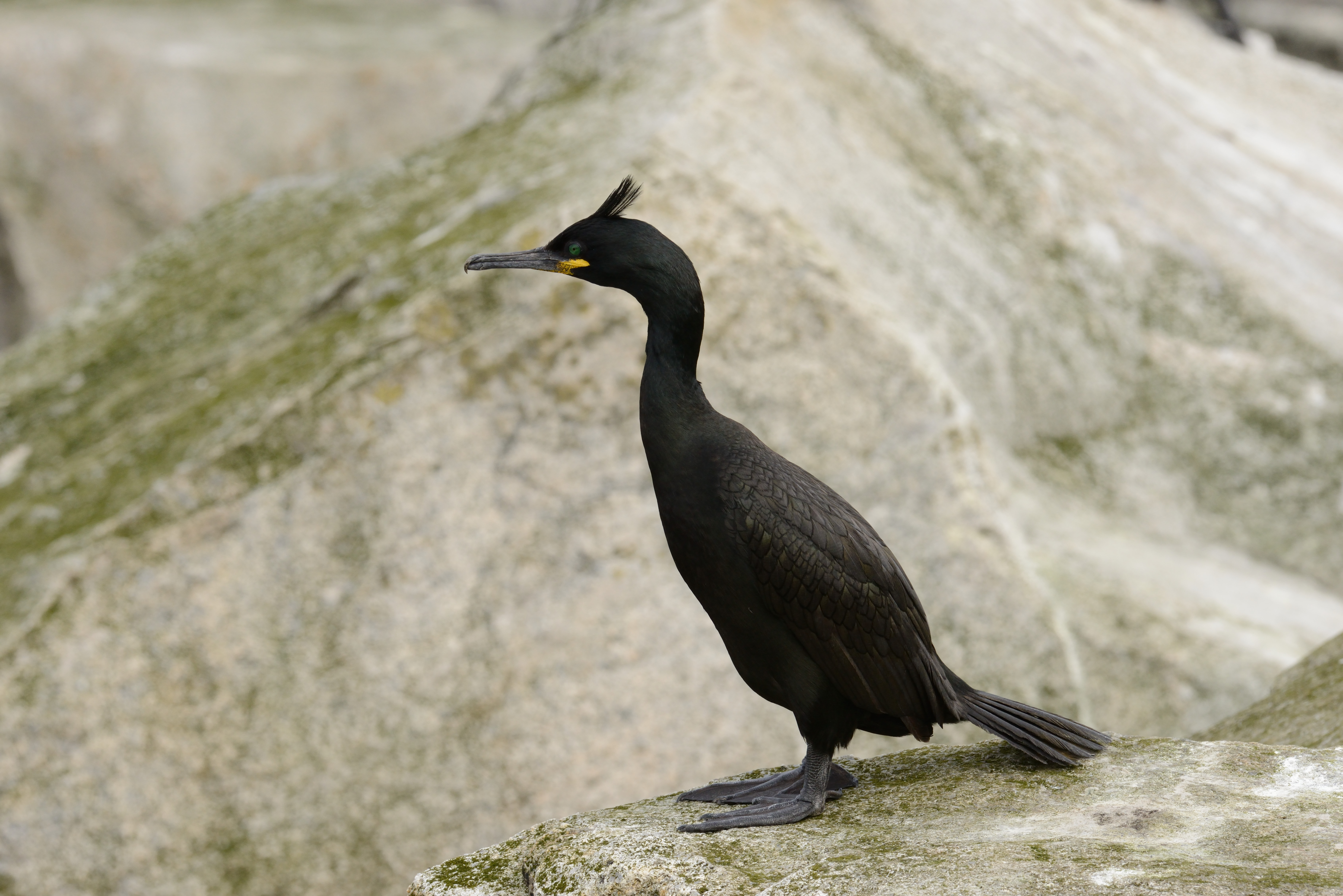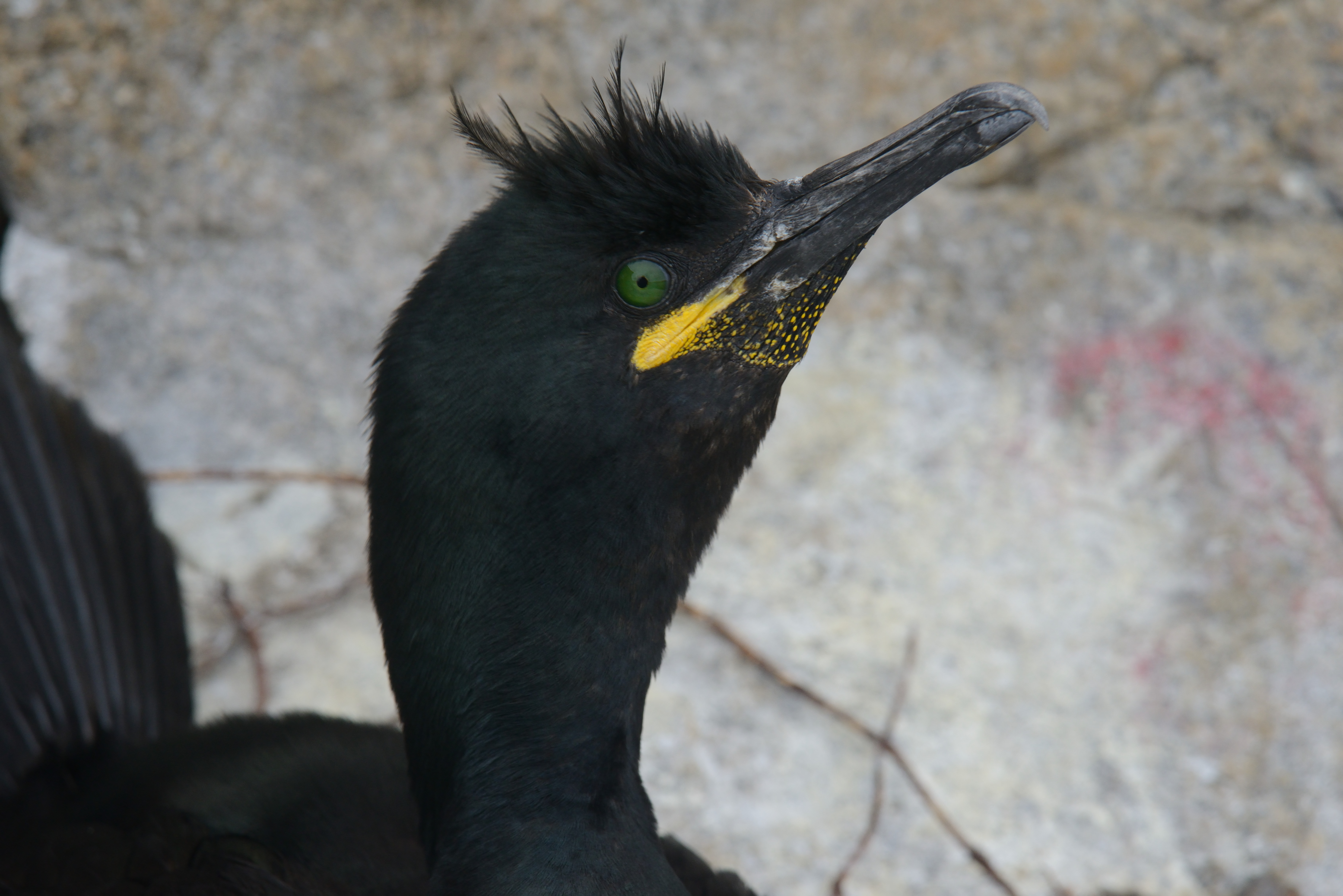 Toppskarven har irrgrønne øyne og en gul basis ved nebbroten. Reiret plasseres ofte skjult i steinur.
