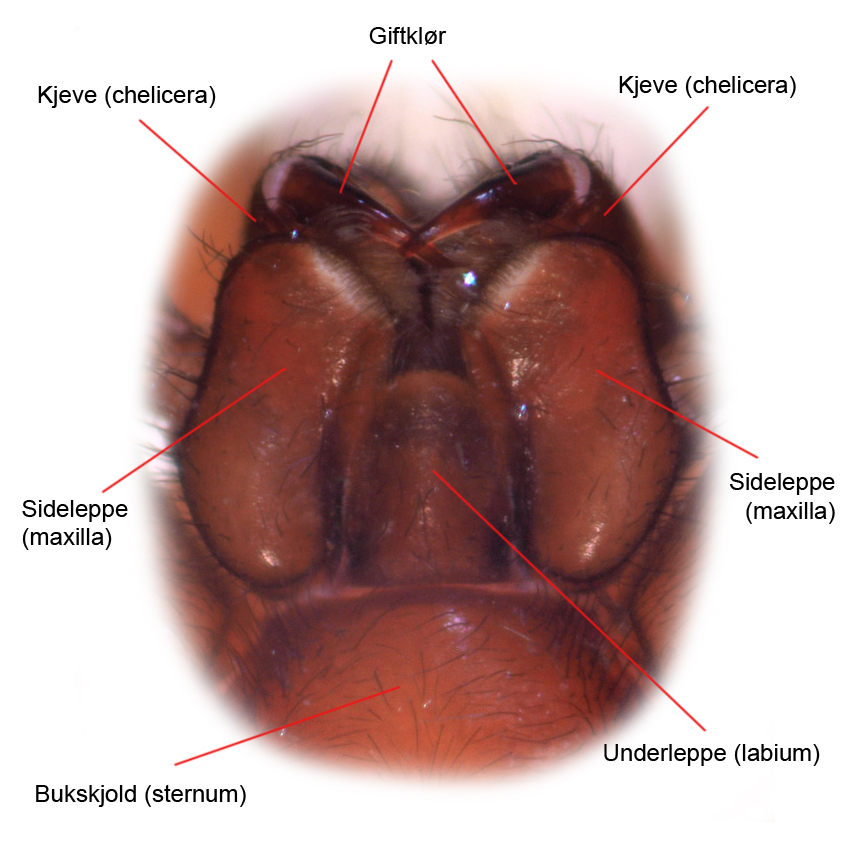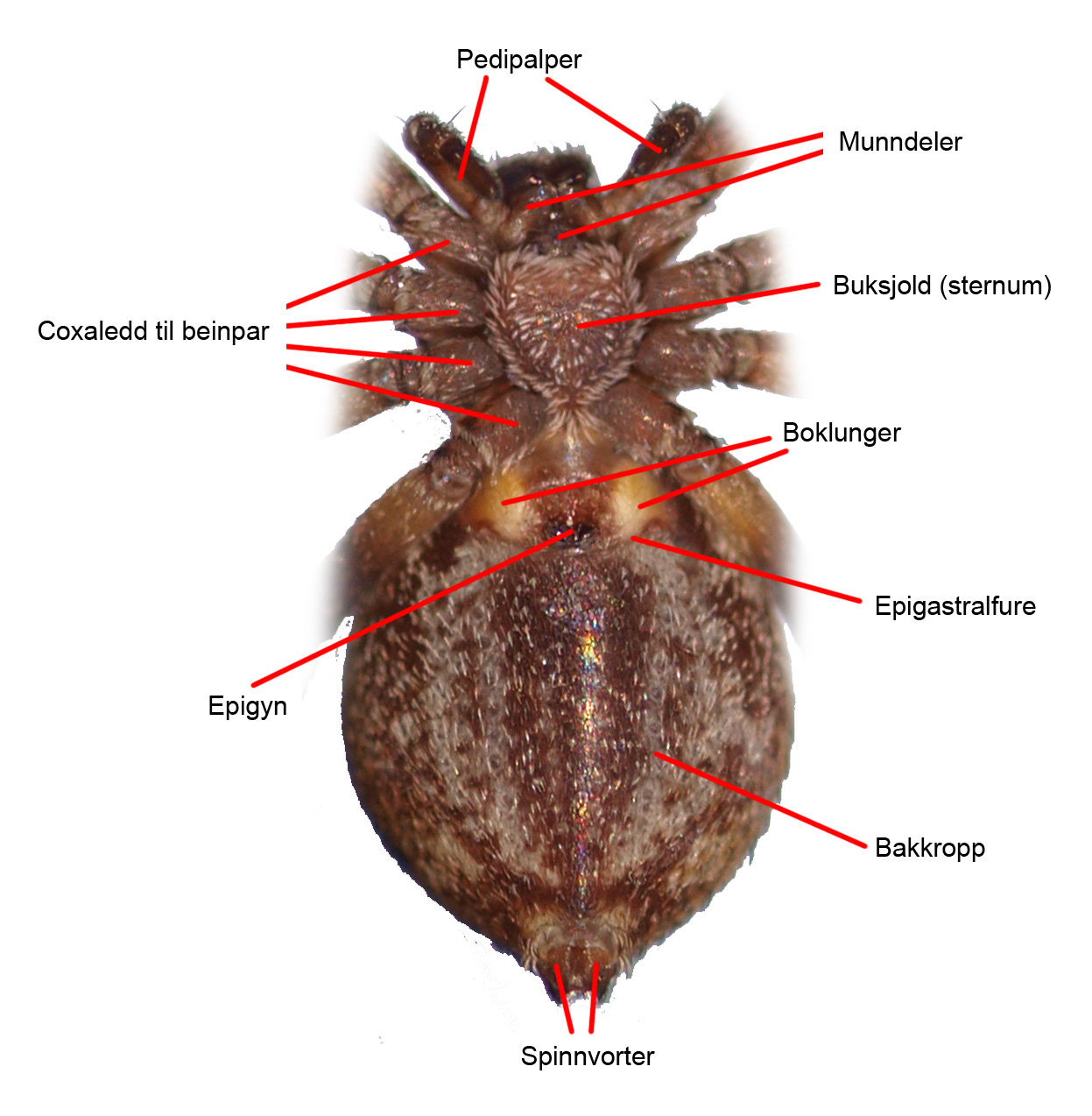 Oversikt over edderkoppenes kroppsdeler. Edderkopper har som andre leddyr et ytre skjelett og er relativt enkelt oppbygget sammenlignet med insektene.