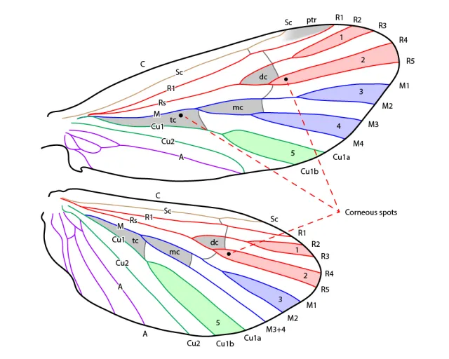 Fram- og bakvingen har det samme grunnmønsteret. Hovedribbene er som følger: Costa (C), Subcosta (Sc), Radius (R), Media (M), Cubitus (Cu) og analribben (A). Hver av ribbene kan igjen være delt opp i flere greiner med individuelle navn. De fem forgreiningene (gaflene) nummerert 1–5 er særlig viktige for bestemmelse. Gaffel 2 kan alltid identifiseres på at det finnes en liten, rundt fortykning av vingemembranen ("corneous spot") nær basis av gaffelen. Gaffel 4 mangler alltid i bakvingen. De viktigste cellene er diskcellen (dc), mediancellen (mc) og thyridialcellen (tc). Thyridialcellen kan ha eller mangle en "corneous spot". Mellom Sc og R1 finnes ofte et fortykket vingemerke/pterostigma (ptr).