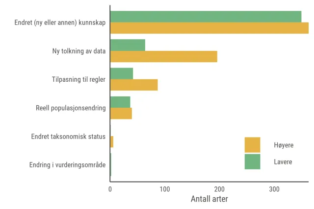Det er ulike årsaker til at arter er vurdert til en annen kategori. Ofte er det ikke en enkelt faktor, men en samlet vurdering av flere faktorer som ligger til grunn for endringene.