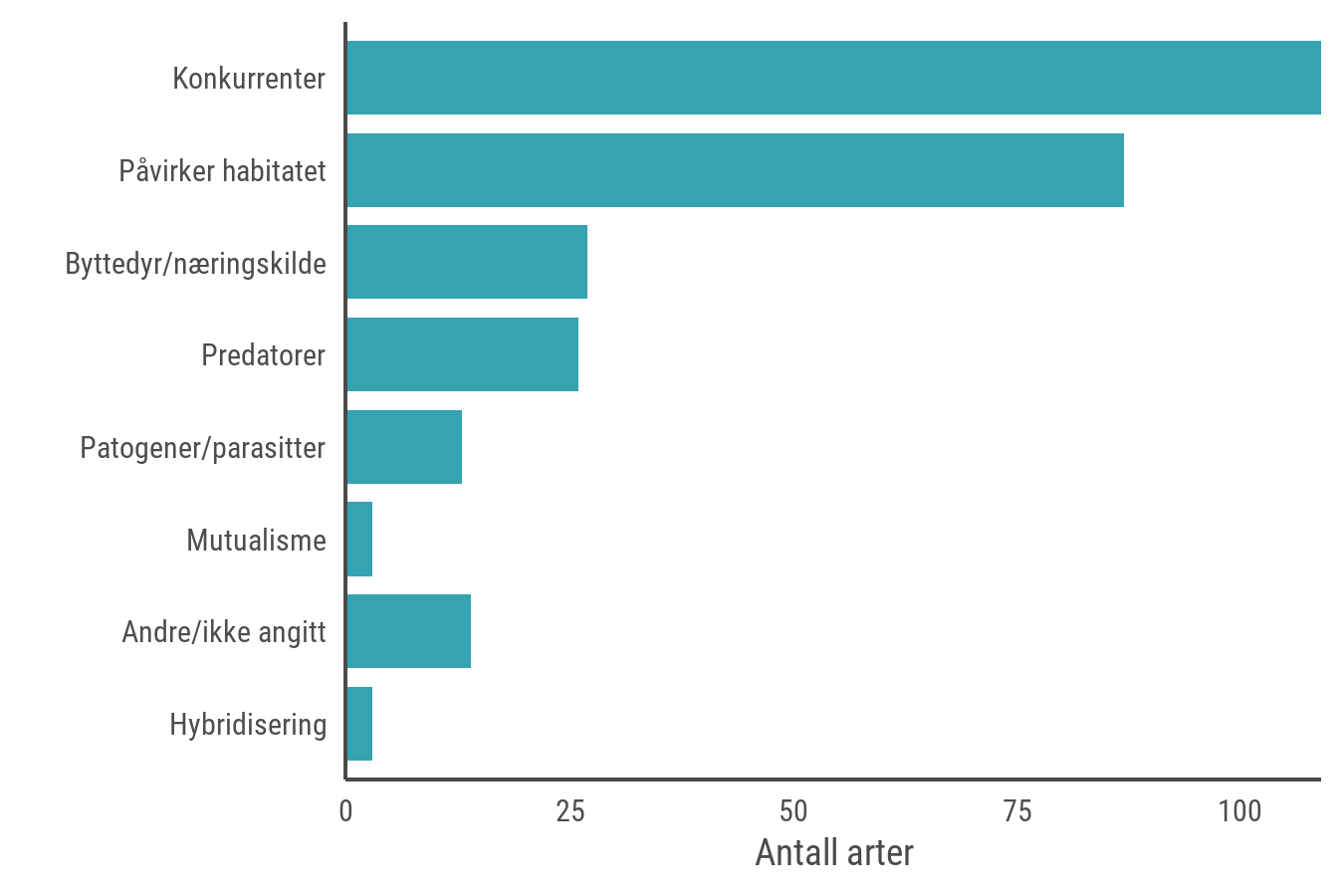 Vi skiller mellom påvirkning fra stedegne arter og påvirkning fra fremmede arter. Fremmede arter er arter som opptrer utenfor sitt naturlige utbredelsesområde, det vil si utenfor det området arten kan spre seg til naturlig uten hjelp av mennesker. Stedegne arter er naturlig hjemmehørende i Norge.