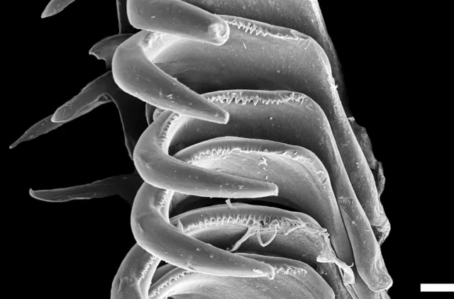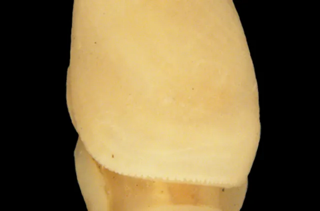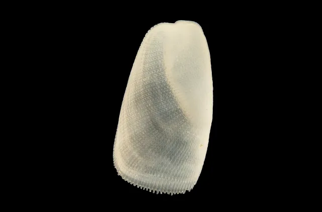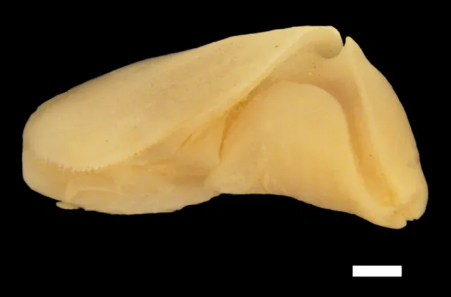 Skallets ventralside (SEM), målestokk = 1 mm.