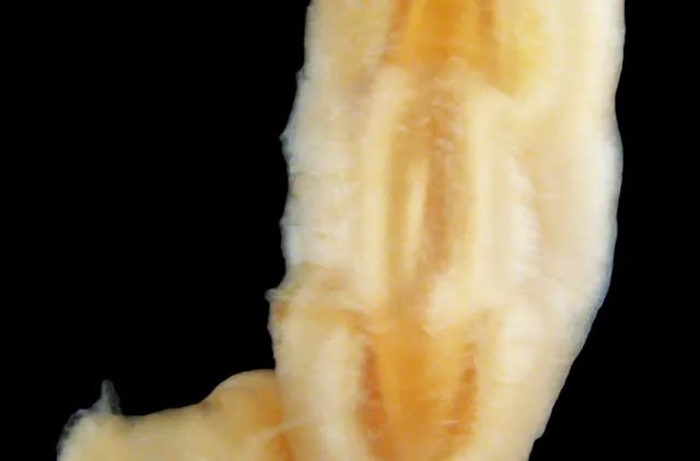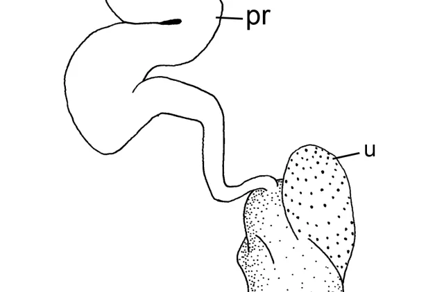 Det hannlige reproduksjonssystemet, målestokk = 250 μm. Forkortelser: pk: peniskammer, pr: prostata, u: utvekst.