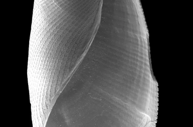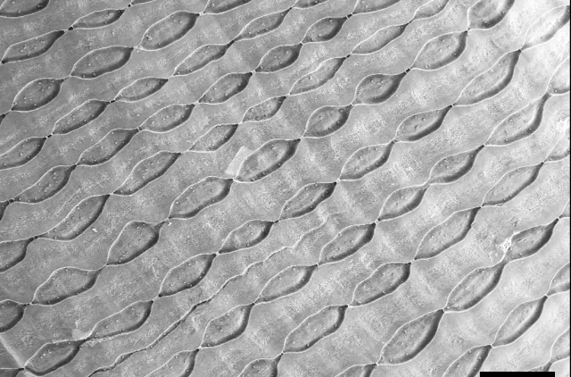 Skulpturen på skallets overflate (SEM), målestokk = 100 µm.