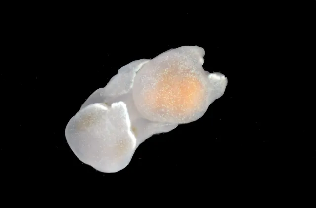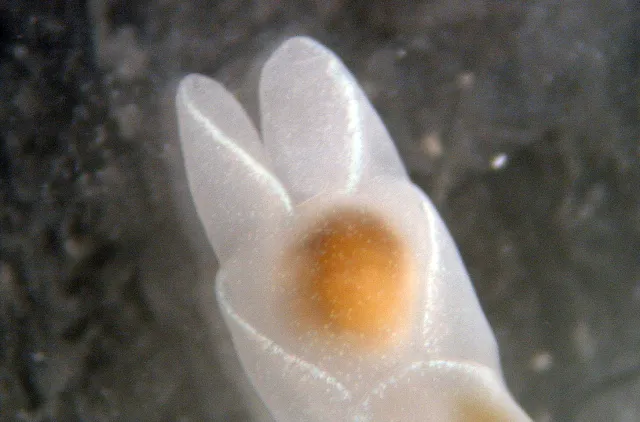 Kroppen er hvitaktig gjennomsiktig med ugjennomsiktige prikker langs kantene av hodeskjoldet, foten og sideforlengelsene av foten (parapodialflikene). Mot bakenden har sneglen to store fliker (forgrenet pallialflik) som også har prikker på kanten. Vevet som dekker skallet (mantelen) er tynt og hodeskjoldet smalner mot bakenden. Store brune sanseorganer (Hancocks organ) er synlig på sidene av hodeskjoldet.