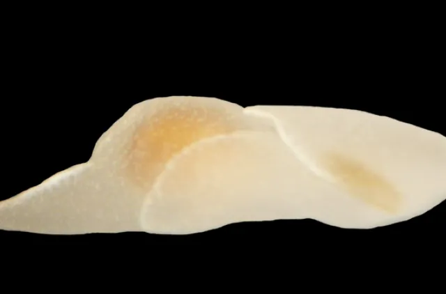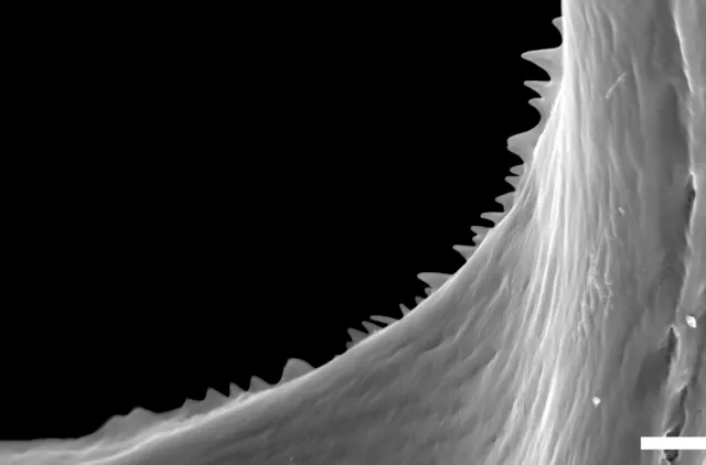 Detalj av dentikulasjonene på den indre sidetannen (SEM), målestokk = 2 µm.